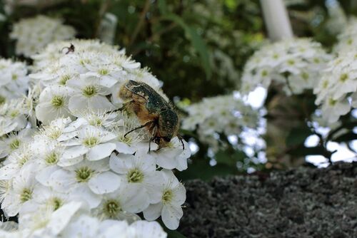 夕方の散歩の折、ユキヤナギの上にいるハナムグリを見付けた。 花の中に貌を突込みかなり早いスピードで花粉を喰っているようだった。 ユキヤナギの花は小さいから全身が花粉にまみれて黄色くなるということはないが、いつだったか野アザミの花の上で見たハ…