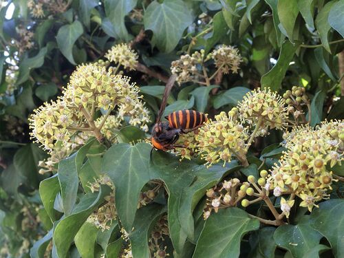 階段の上に覆いかぶさるように伸びていた木蔦を3年ほど前に刈り込んで小さくしていたが、今は相当に大きくなっている。その木蔦では小さな花が今盛り、独特の臭いを放っている。この花に今朝はコガタスズメバチが2匹やって来ていた。小さな花びらの先っぽ…