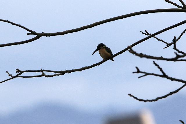 偶然と言うか幸運と言うか、車を降りて土手道をあるき始めて直ぐに、木の枝の高みにいるカワセミを見つける。残念ながらカワセミのいる場所は分厚い雲に遮られて光が届かない、それにカワセミまでは100mほどの距離、そこは近づくことの出来ない場所なのだ。証拠写真までにと1ショットした。